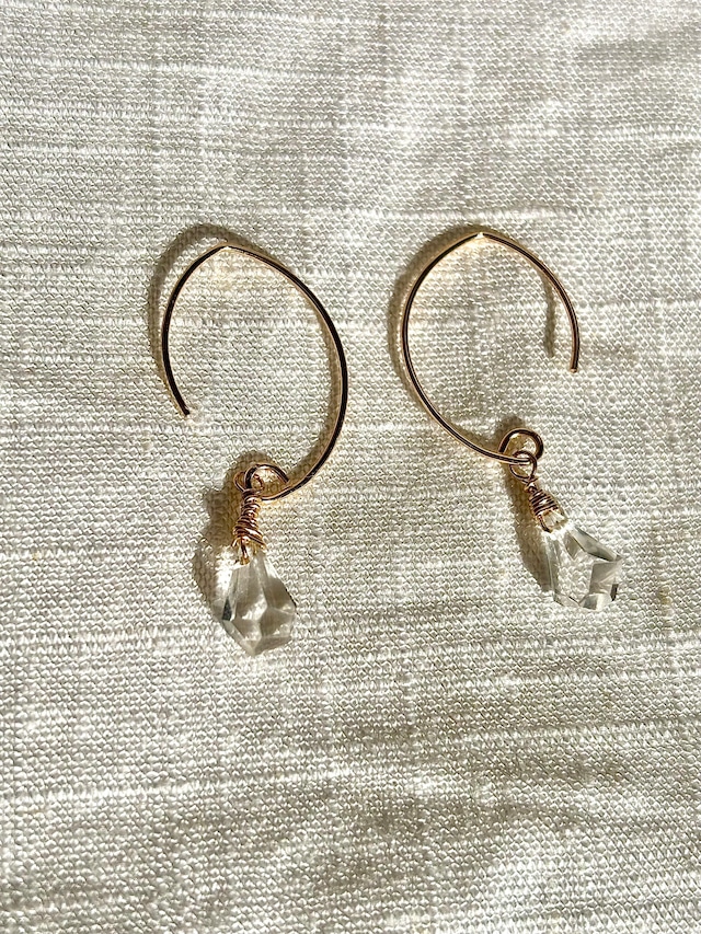 【14kgf】Crystal drop Pierce しずくのようなフォルム。 フック部が深めなのでGold colorが華やかさを引き立てます。 デイリーから特別な日のコーディネートにまで。 長さ:約4cm 素材:14kgf(ゴールドフィルド) 天然石:Crystal/Green Amethyst 【14KGF(ゴールドフィルド)について】 14KGFとは素材の名称で、真鍮等の表面に14Kが厚くコーティングされたものです。 特殊な加工で貼付けているため、メッキ加工と異なり剥がれづらいです。 丁寧に扱えば半永久的に使用出来ると言われる素材ですので、リーズナブルにゴールドの輝きを楽しみたい方におすすめです。 また、一般的に金属アレルギーも起こしづらいと言われています。 (個人差がございます。) •金属アレルギーの方 •一つのジュエリーを変色を気にせず長くご使用になりたい方 におすすめ致します。