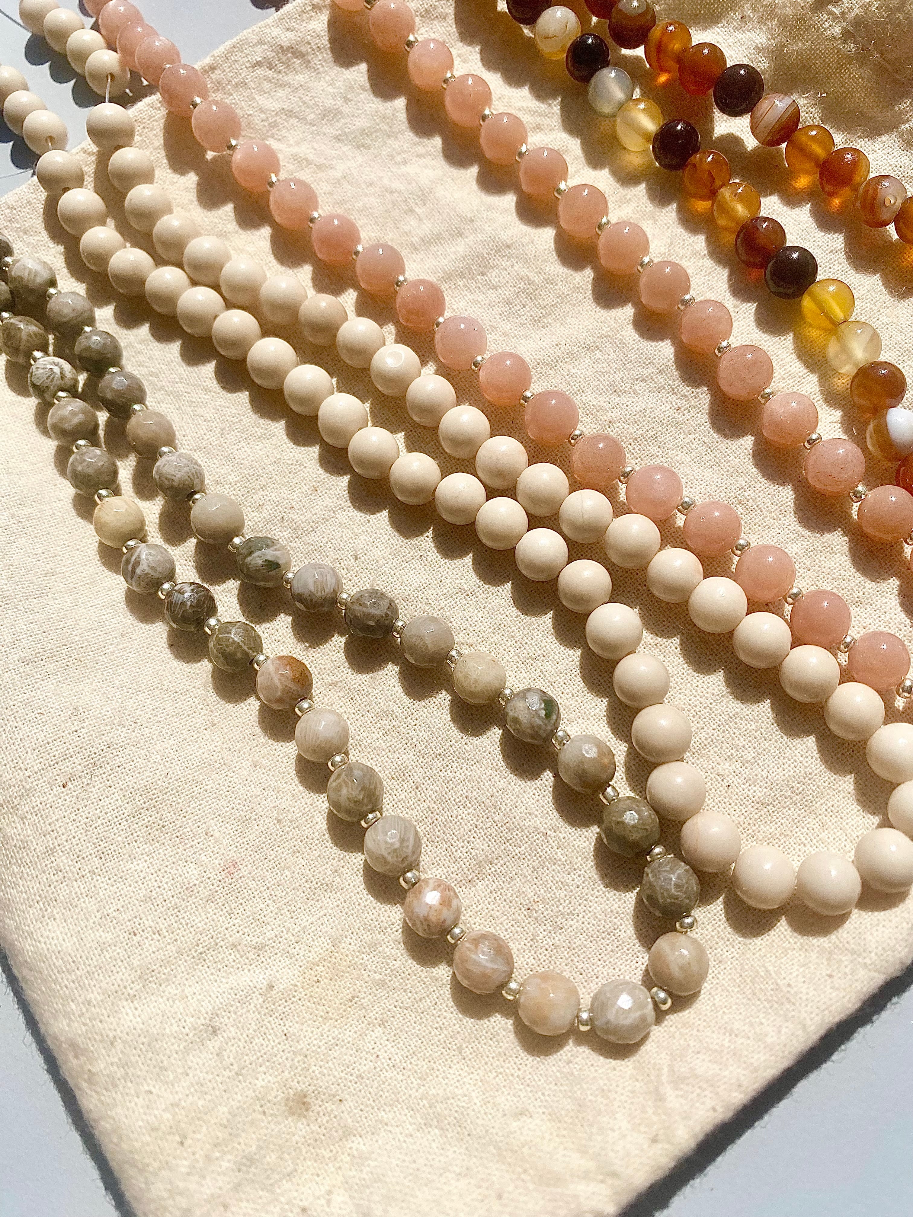フォシルコーラル/リバーストーン/ムーンストーン /ブラウンアゲートの落ち着いたニュアンスカラー4種類。(写真順)